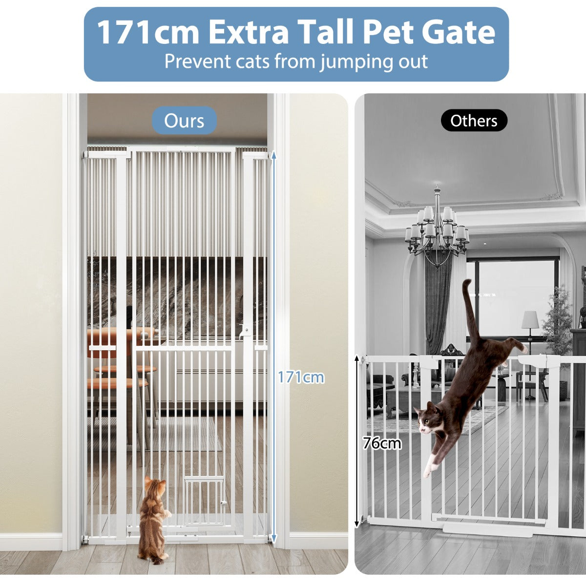 Met het extra hoge LIVSK huisdierhek bescherm je niet alleen je huis, maar ook je geliefde huisdieren! Dit huisdierhek is 150 cm tot 171 cm hoog, waardoor het ideaal is voor grotere huisdieren en springerige viervoeters. Dankzij de twee uitbreidingssets kan de breedte worden aangepast van 77 cm tot 104 cm, waardoor je het perfect kunt afstemmen op verschillende openingen. De installatie is eenvoudig met een push-in-kit voor een boorvrije installatie of een hardware-montageset voor permanente bevestiging.
