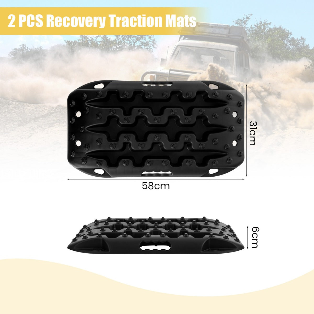 Ontdek de LIVSK offroad tractiematten, de perfecte metgezel voor je outdoor-avonturen. Deze set bevat 2 robuuste tractiematten gemaakt van lichtgewicht nylonmateriaal, elk in staat om tot 10 ton te dragen en bestand tegen temperaturen van -30°C tot 60°C. Met verbeterde noppen en tanden aan beide zijden verhogen deze tractiematten de wrijving tussen je banden en de ondergrond, waardoor het doordraaien van je voertuigbanden wordt voorkomen.