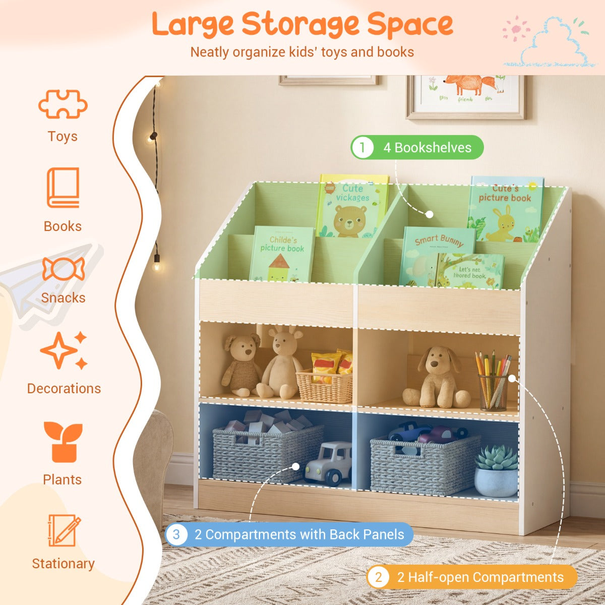 Geef je kleintjes hun eigen bibliotheek met het LIVSK houten kinderboekenrek! Met een hoogte van 80 cm is dit boekenrek ideaal voor kinderen om zelfstandig hun favoriete boeken te bekijken en te pakken. De 4 boekenvakken met frontzicht presenteren prentenboeken, terwijl de ruime onderste vakken perfect zijn voor speelgoed, planten of decoraties. De verdikte planken kunnen zonder problemen zware stapels boeken dragen en de gladde, afgeronde randen beschermen de kleintjes tijdens het ontdekken. Met kantelbeveiligingen en antislipvoetjes zorgt dit boekenrek voor stabiliteit, zodat jij kunt ontspannen tijdens levendige voorleessessies. Deze boekenorganizer biedt slimme opbergruimte voor speelkamers, slaapkamers of kinderdagverblijven en creëert een leuke en opgeruimde ruimte voor kinderen om te leren en te groeien!