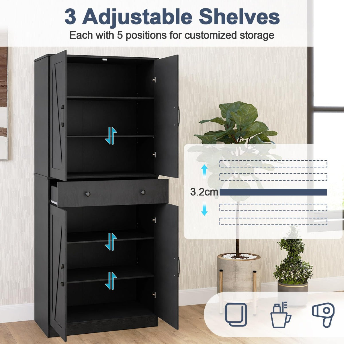 - Verstelbare hoogte verplaatsbare planken: 3,2 cm