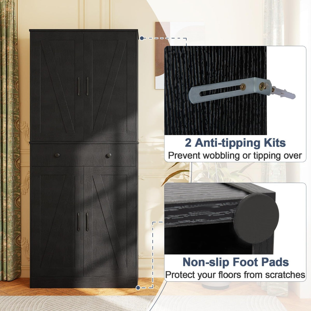 Met de LIVSK buffetkast heb je alles wat je nodig hebt in de keuken! Deze kast biedt ruime opbergruimte met 2 grote kasten, een lade en drie verstelbare planken met 5 standen, perfect voor het organiseren van snacks, kruiden en meer. Dankzij de stevige planken en antislipvoetjes kan de kast tot wel 186 kg dragen zonder te kantelen, terwijl de 2 anti-kantelsets voor extra veiligheid zorgen. De soft-close scharnieren en gladde rails voegen een vleugje luxe toe aan het geheel, terwijl de charmante schuurdeuren zorgen voor een gezellige boerderijuitstraling.