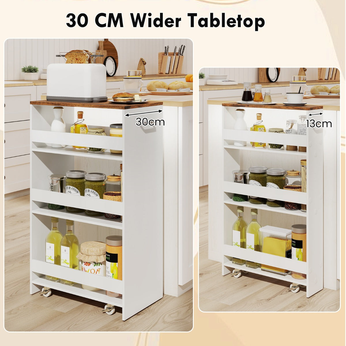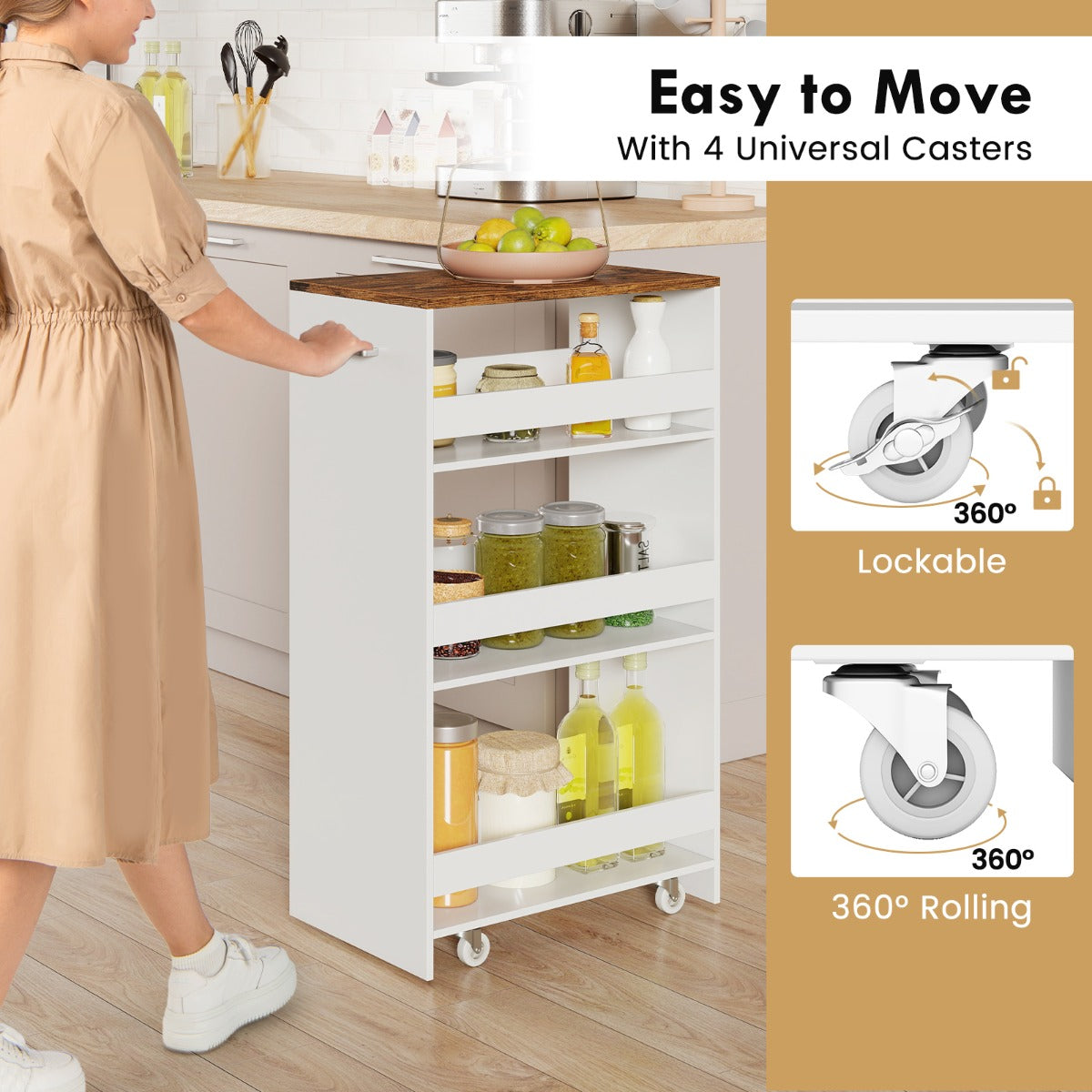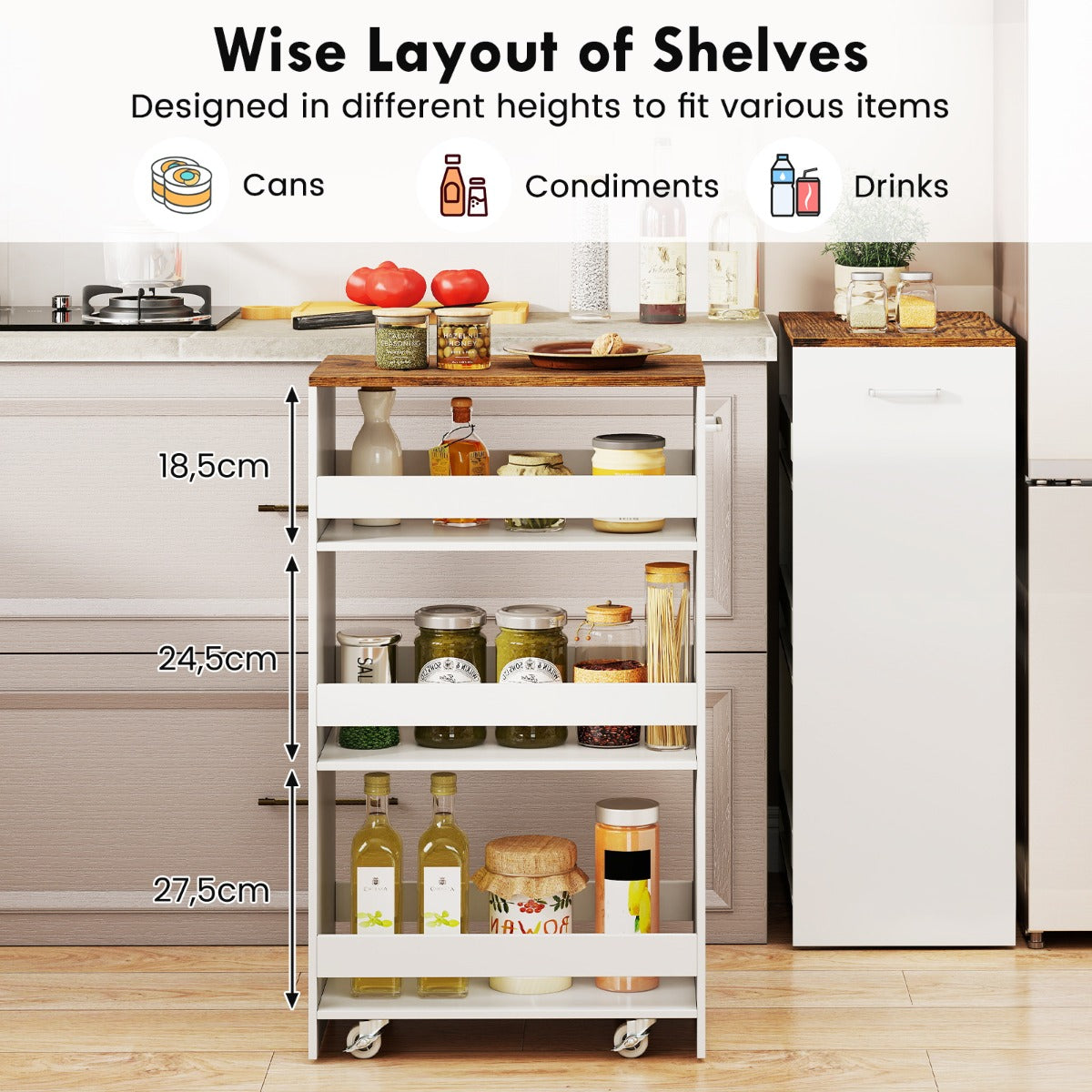 De LIVSK opbergwagen is dé efficiënte en praktische oplossing voor het organiseren van spullen in huis. Met 4 opbergniveaus biedt deze kar een handige indeling voor het opbergen van keukengerei, kantoorbenodigdheden, knutselspullen en meer. Het compacte en ruimtebesparende ontwerp maximaliseert de opbergruimte in elke ruimte, terwijl de 4 soepel lopende wielen en handige handgreep het verplaatsen gemakkelijk maken. Met het verdikte blad is deze opbergwagen een betrouwbare toevoeging aan je woonruimte, waardoor je keuken schoon en georganiseerd blijft.