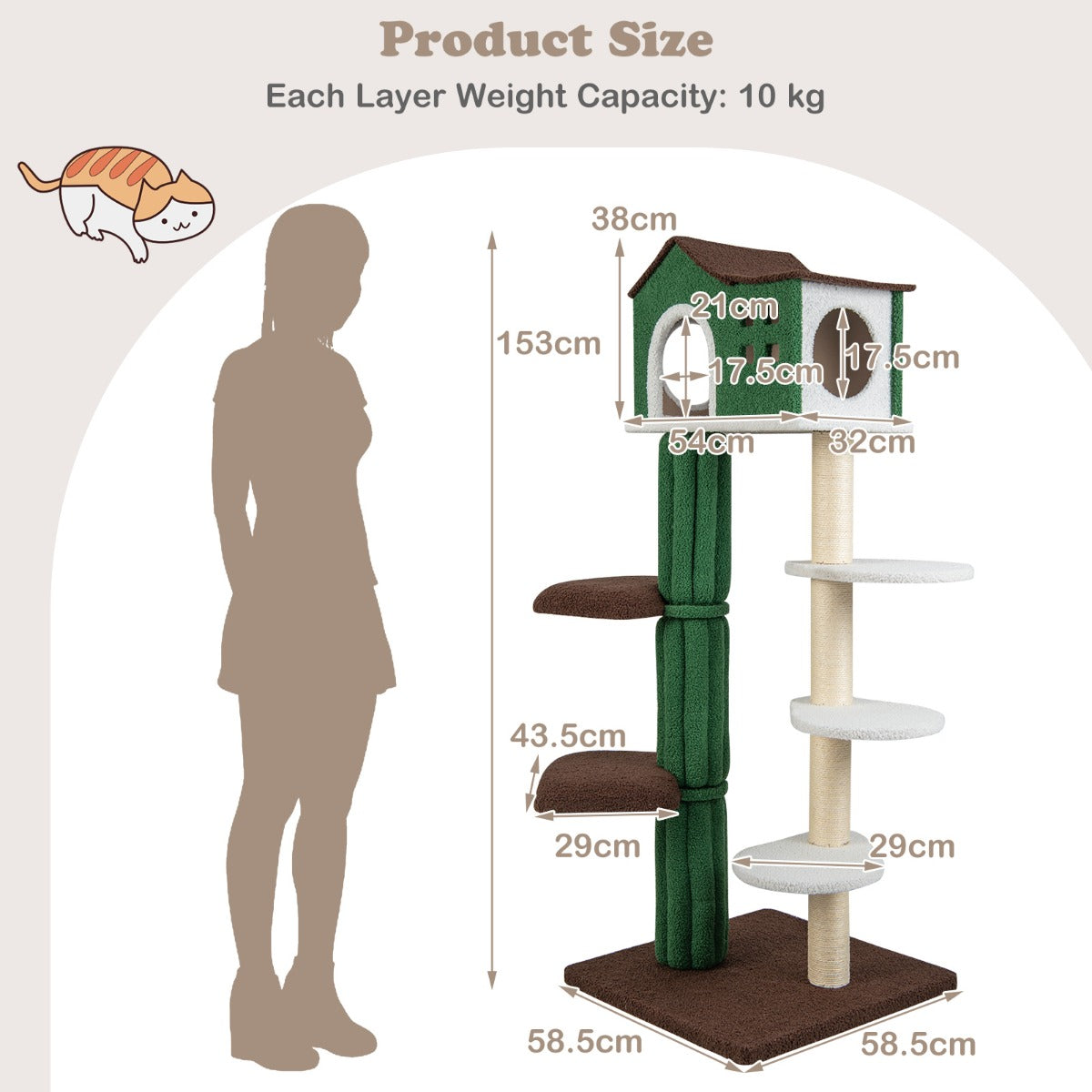 LIVSK Meerlaagse Krabpaal met Huis en 5 Platforms - Met Sisal Beklede Palen - Veilig en Stabiel - 58,5 x 58,5 x 153 cm - Groen