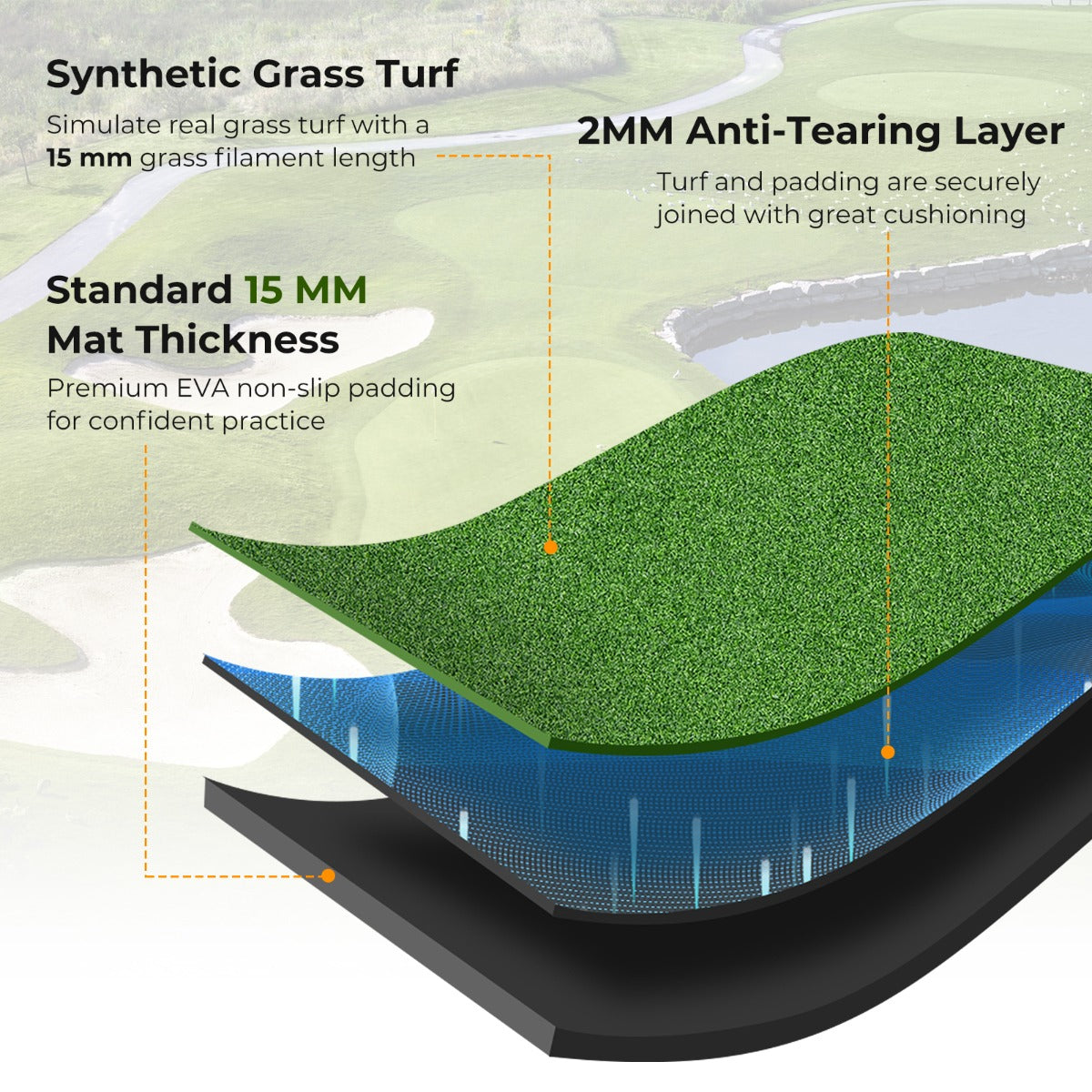 Meerlaagse constructie garandeert langdurige prestaties Kunstgras geeft een realistisch gevoel Scheurbestendige vulling voegt duurzaamheid toe Eersteklas EVA-laag zorgt voor optimale schokabsorptie Ontworpen met handige voorgeboorde gaten voor eenvoudige aanpassing Geschikt voor links- en rechtshandige golfers Veelzijdig ontwerp voor verschillende golfdoeleinden