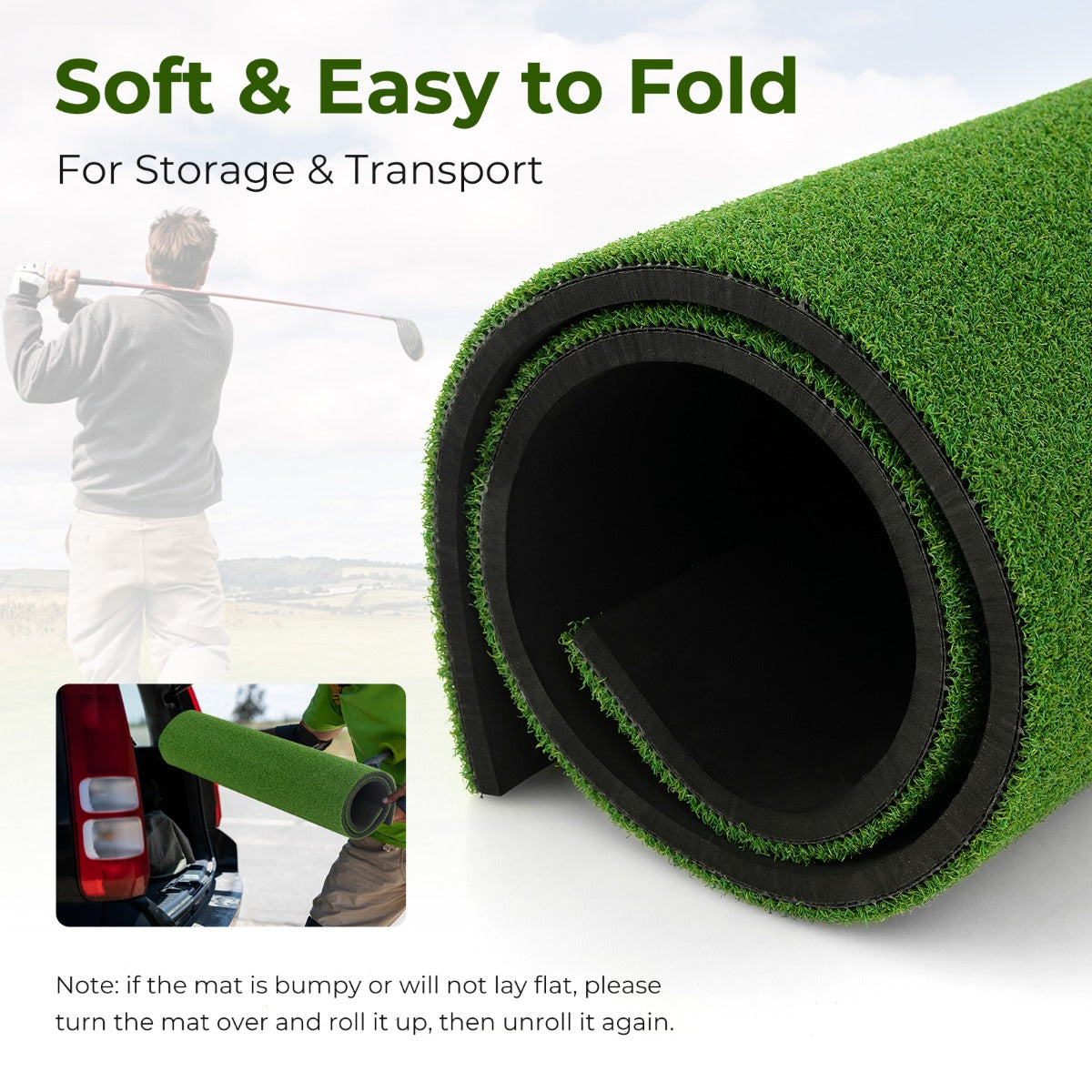 Verbeter je spel met onze golfmat, ontworpen voor nauwkeurige uitlijning en een realistische ervaring. De mat is gemaakt van meerlaags materiaal en biedt optimale, langdurige prestaties. De tee holes zijn geschikt voor zowel links- als rechtshandige golfers, zodat je moeiteloos kunt oefenen. Het kan ook gebruikt worden om te chippen, pitchen en zelfs als doel. Het is gemakkelijk op te rollen en op te bergen, waardoor het ideaal is voor zowel binnen- als buitentrainingen. De bijgeleverde alignment stick helpt je bij het verfijnen van je swing. Attributen: Uitlijnstokken:Verfijn je swing en til je spel naar een hoger niveau met onze handige uitlijnstokken. Je kunt de stokken kruisen om te richten of parallel plaatsen voor een goede oriëntatie en houding tijdens het oefenen. Hoogwaardige constructie:Gebouwd met een meerlaags ontwerp, heeft onze slagmat realistische grasmatten voor een realistische golfbaan oefenervaring. Bovendien zorgen de scheurvaste vulling en de eersteklas EVA-laag voor langdurige prestaties. 6 gaten:Met 6 voorgeboorde gaten voor golf tees en 2 bijgeleverde golf tees is onze oefenmat geschikt voor zowel links- als rechtshandige golfers. Bovendien garanderen deze tee holes nauwkeurige, consistente slagen, elke keer weer, voor beginners of professionals, zodat je je vaardigheden kunt verbeteren.