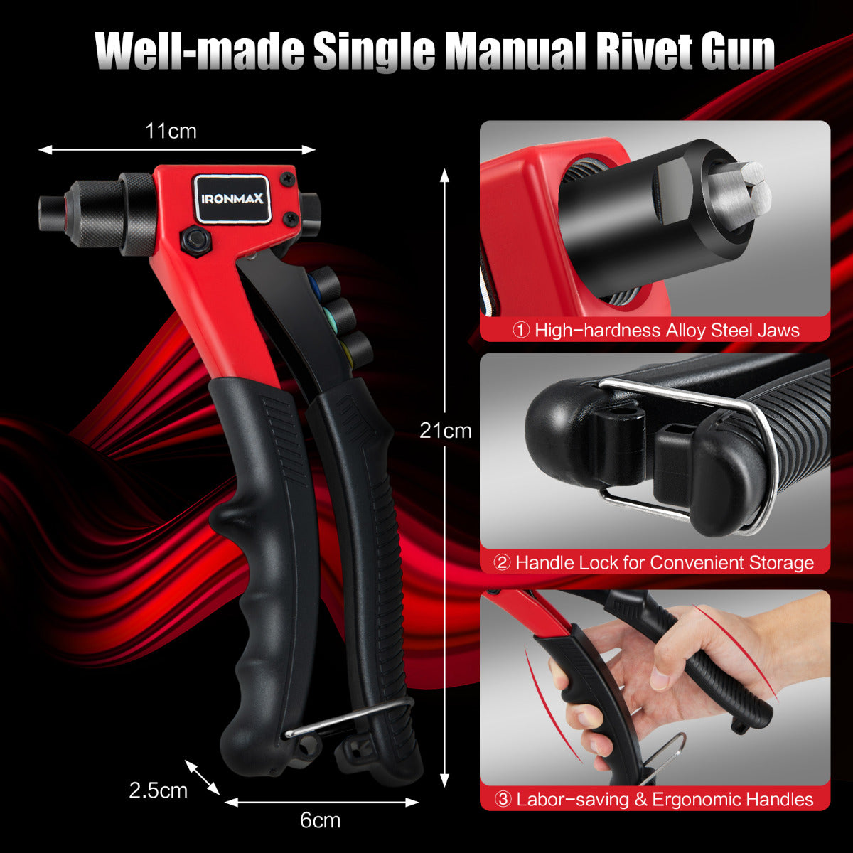 - Afmetingen rivet gun: 21 x 11 x 2,5 cm (L x B x H)