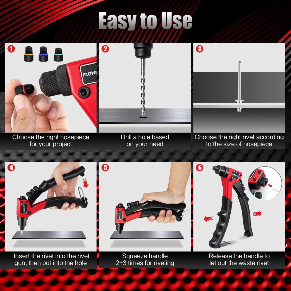 De LIVSK handriveteer is een krachtig gereedschap voor intensieve klinkwerkzaamheden, met een duurzaam lichaam van hoge-hardheid aluminiumlegering, massief gelegeerde stalen kaken en een handvat van koolstofstaal met versterkte warmtebehandeling. Dankzij de ergonomisch gebogen handgrepen met PVC-hulzen is het niet alleen arbeidsbesparend, maar ook comfortabel en beschermt het je handen. Met 4 gekartelde rivets koppen die gemakkelijk te vervangen zijn zonder gereedschap en een stevige draagtas voor georganiseerde opslag, maakt deze handriveteer elke klus eenvoudig.