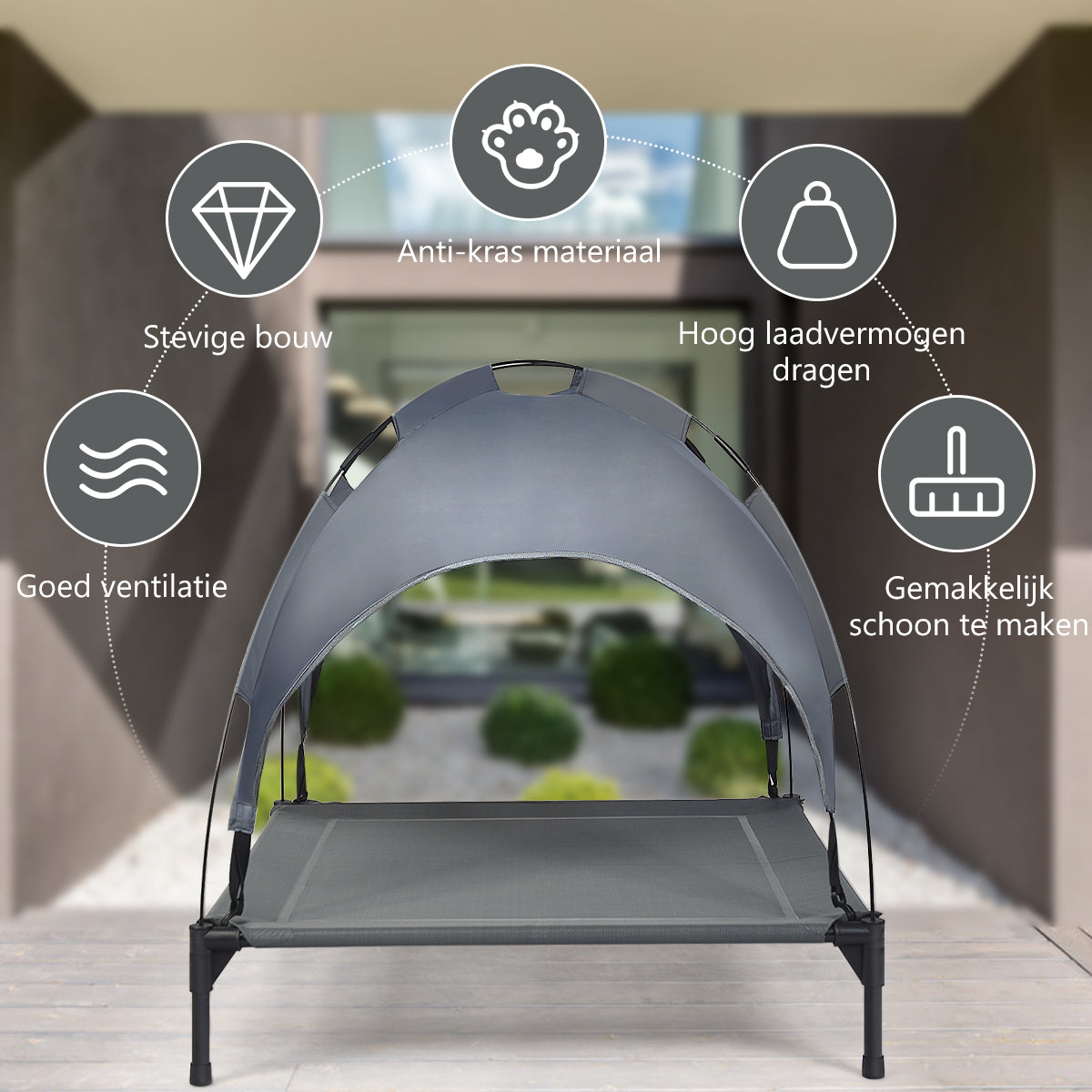 Geef jouw huisdier een comfortabele plek om te ontspannen met het LIVSK verhoogde huisdierenbed met luifel. Dit bed biedt een verhoogd ontwerp waardoor jouw huisdier kan genieten van een betere luchtcirculatie en beschermd blijft tegen harde en natte ondergronden. De afneembare overkapping zorgt voor voldoende schaduw en beschermt tegen zonlicht en regen, ideaal voor buitenactiviteiten.