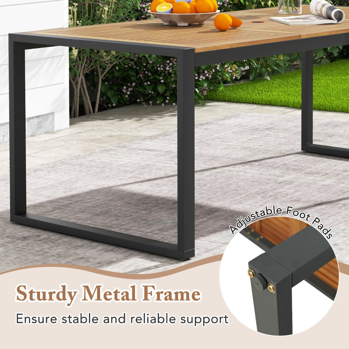 Maak je buitenruimte compleet met de elegante LIVSK eettafel van acaciahout voor 8 personen, waar duurzaamheid samengaat met elegantie. Deze terrastafel heeft een sterk en splintervrij acaciahouten oppervlak dat zowel schoonheid als duurzaamheid biedt. Het stabiele metalen frame is voorzien van verstelbare voetkussens voor stabiliteit op elke ondergrond. Met een 5 cm groot parasolgat en houten blok is deze rechthoekige tafel geschikt voor de meeste standaard terrasparasols (niet inbegrepen) en biedt ruimte aan 8 personen, perfect voor je tuin, terras, bij het zwembad of in de achtertuin.