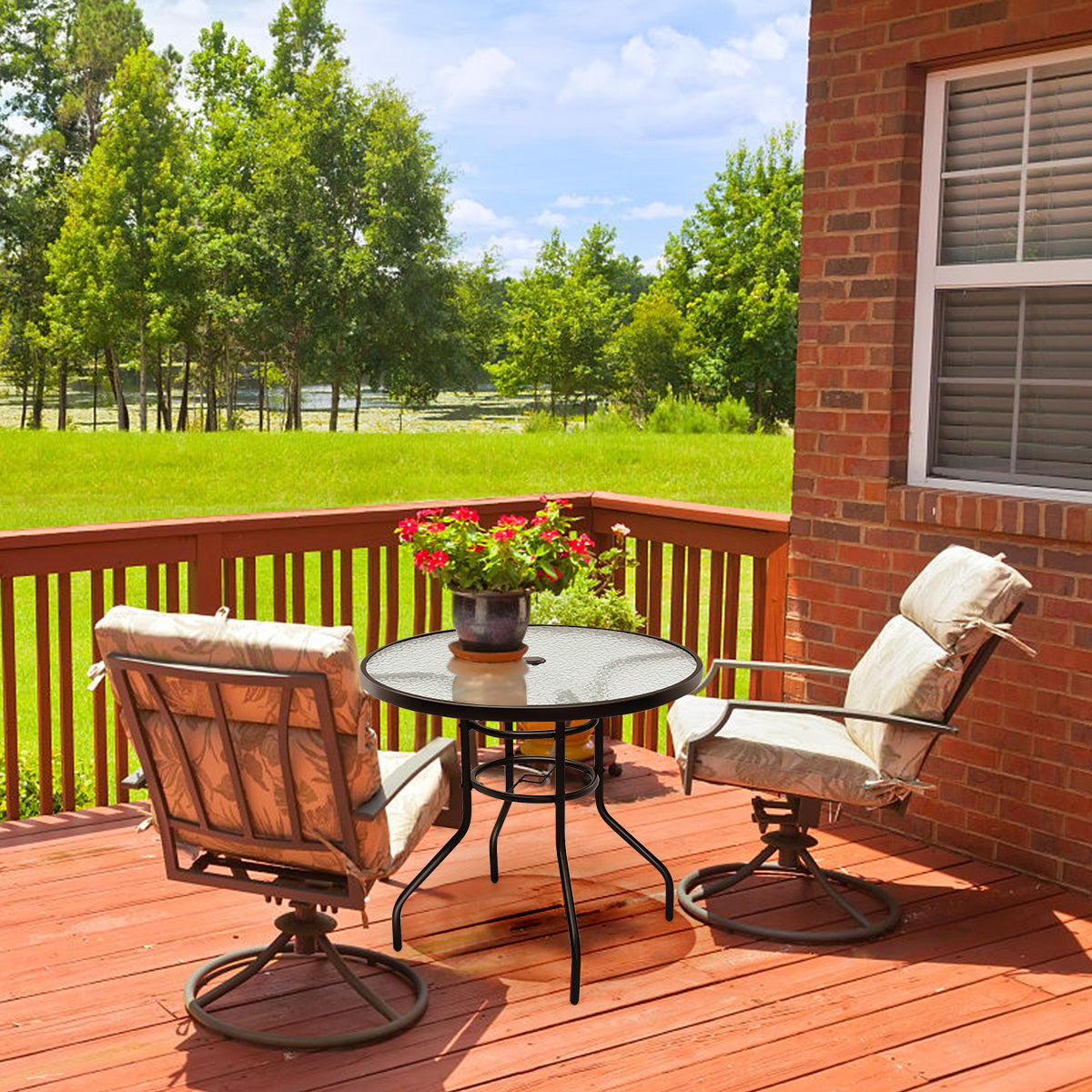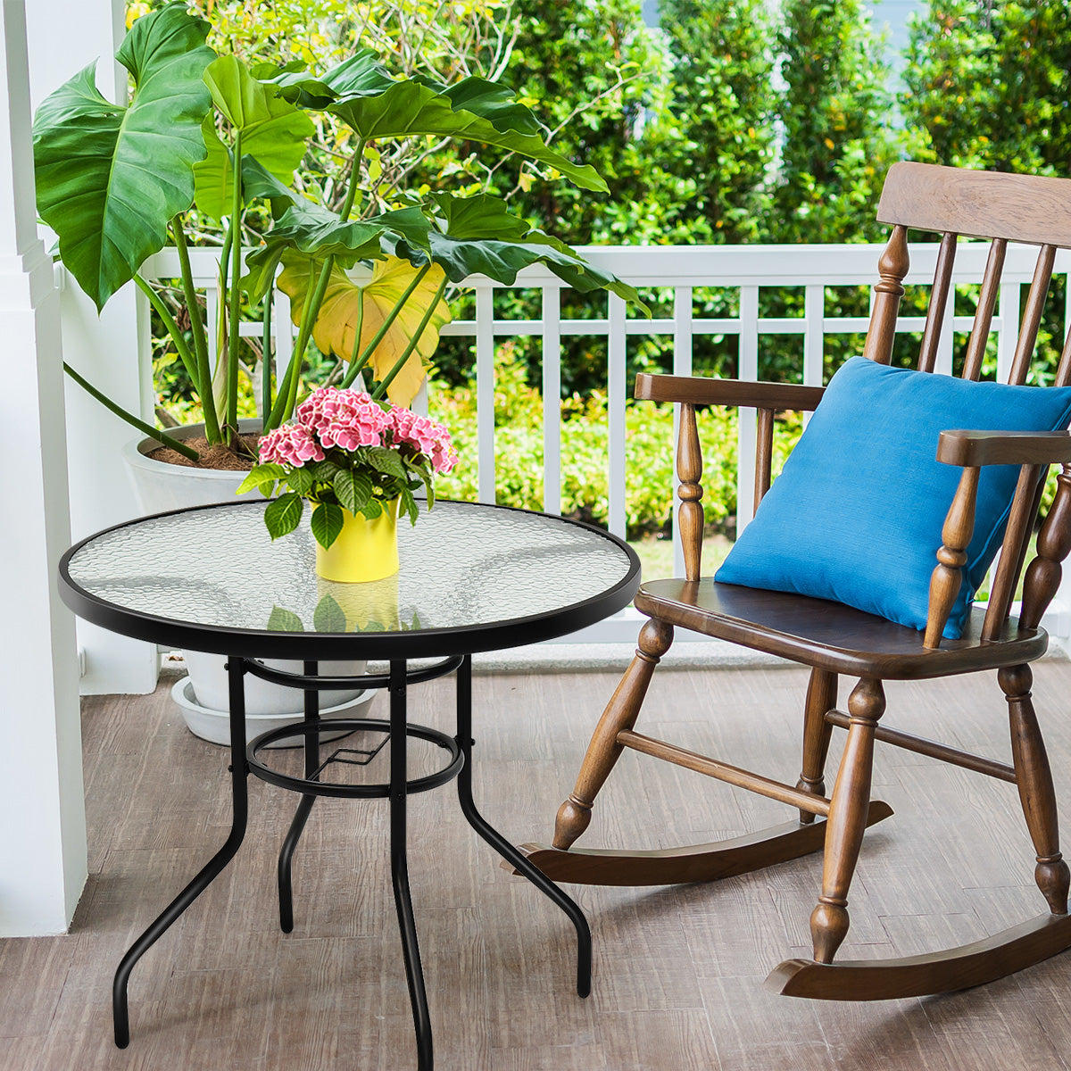 De LIVSK patiotafel voor buiten is de perfecte toevoeging aan jouw terras of tuin. Met een diameter van 81 cm biedt deze tafel voldoende ruimte om te genieten van eten, lezen en ontspannen. Het moderne geharde glazen tafelblad geeft de tafel een unieke uitstraling en is bestand tegen roest en corrosie. Dankzij het praktische paraplugat in het midden van het blad kan je genieten van optimale bescherming tegen zonlicht en neerslag.
