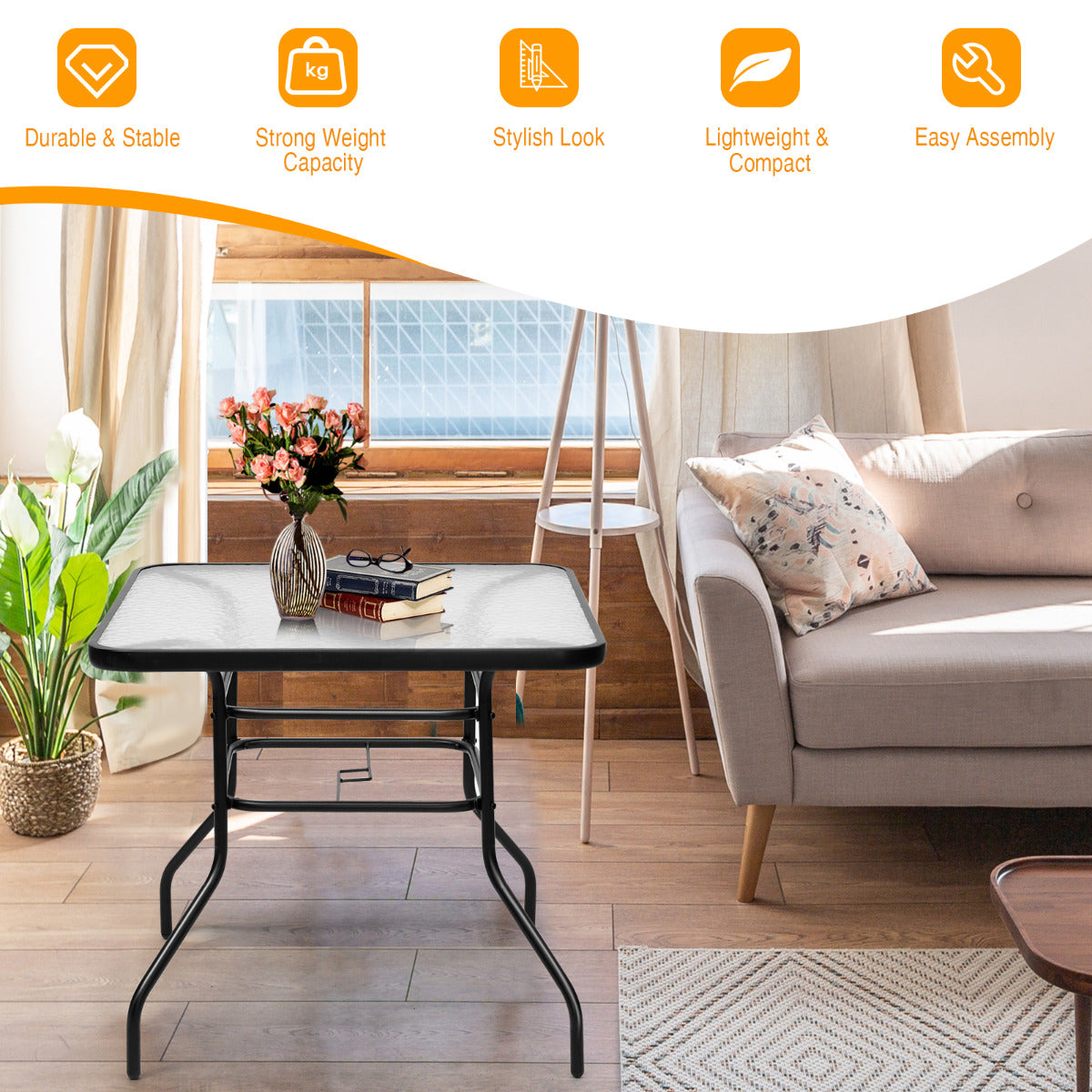 - Groot gehard glazen tafelblad: krasbestendig en hittebestendig met voldoende ruimte voor snacks en drankjes