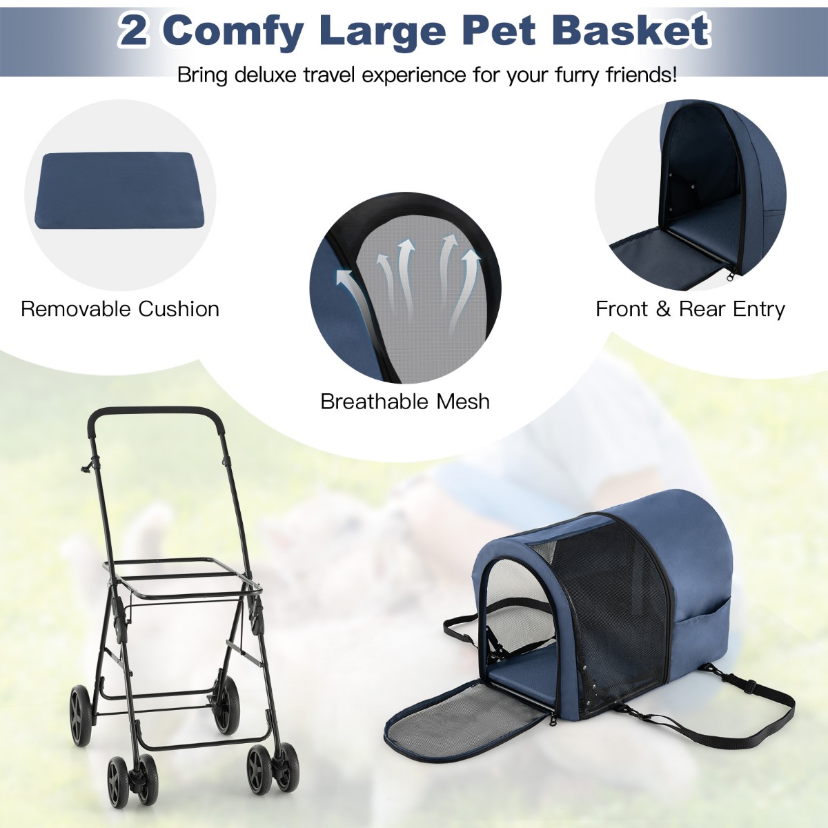 Met de LIVSK 4-in-1 huisdierenwandelwagen heb jij altijd de perfecte reisgenoot voor jouw geliefde viervoeter! Deze multifunctionele wandelwagen wordt geleverd met 2 afneembare huisdierdragers en kan worden gebruikt als dubbele huisdierenwandelwagen, draagtas, huisdierkrat of autozitje. Zo neem je jouw huisdier moeiteloos mee naar de dierenarts, voor een wandeling, tijdens het winkelen of op reis. De wandelwagen is gemaakt van hoogwaardig Oxford-doek en een stevig metalen frame, waardoor duurzaamheid, veiligheid en stabiliteit gegarandeerd zijn.