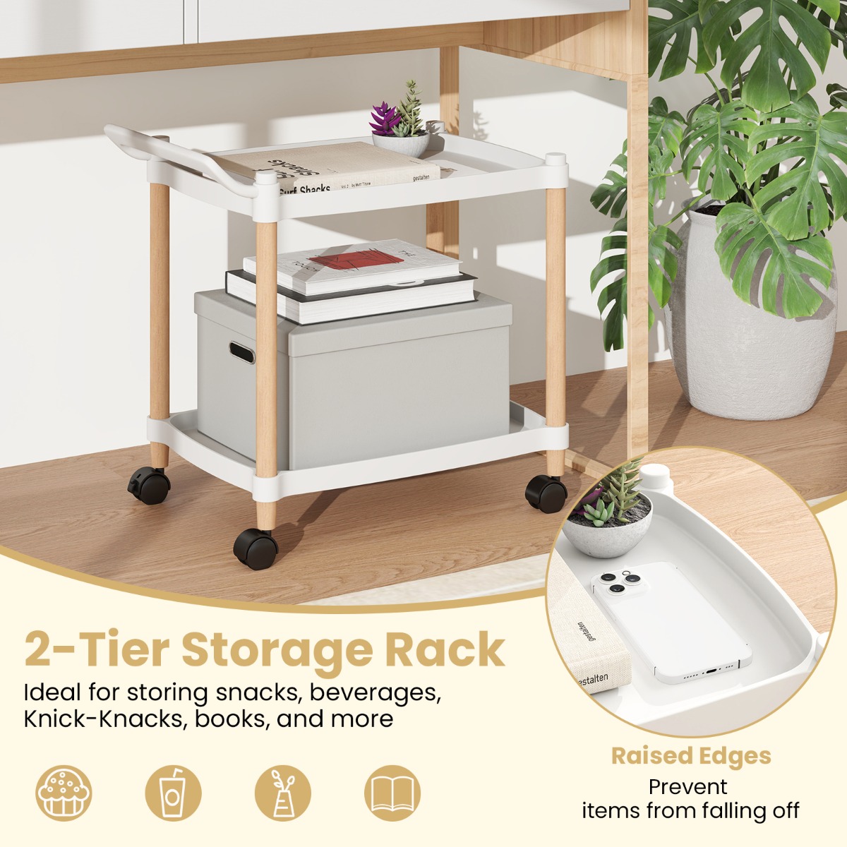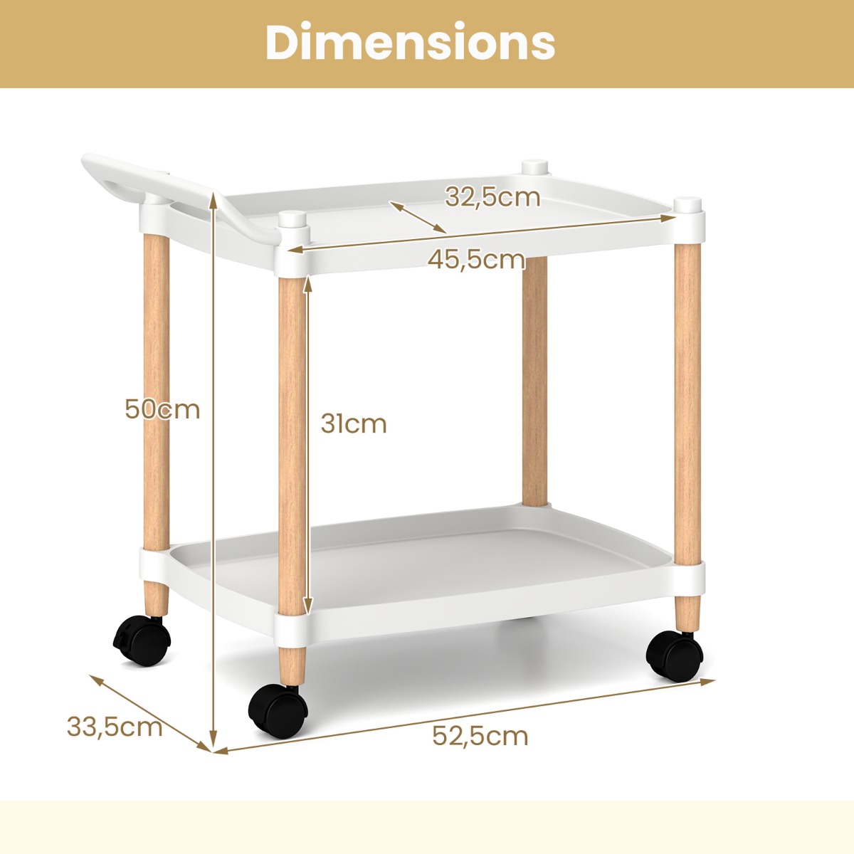 Maak optimaal gebruik van je ruimte met onze stijlvolle en functionele LIVSK trolley met 2 verdiepingen! Met 2 open schappen voor gemakkelijke toegang is deze trolley ideaal voor het opbergen van hapjes, drankjes, snuisterijen, boeken en nog veel meer. Gemaakt van hoogwaardig PP en massief beukenhout, garandeert deze serveerwagen duurzaamheid en betrouwbaarheid. Dankzij de soepele universele wielen en het handige handvat is het verplaatsen een fluitje van een cent. Of het nu in de keuken, woonkamer of kantoor is, deze veelzijdige trolley past zich aan jouw behoeften aan. Blijf georganiseerd met stijl en gemak dankzij deze opbergtrolley!