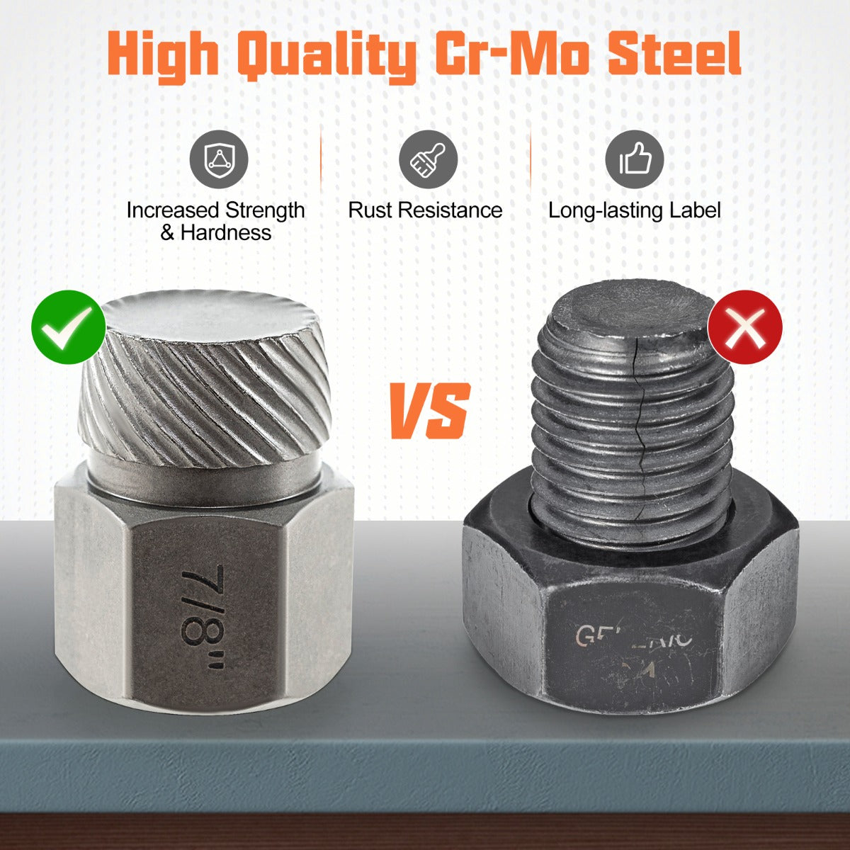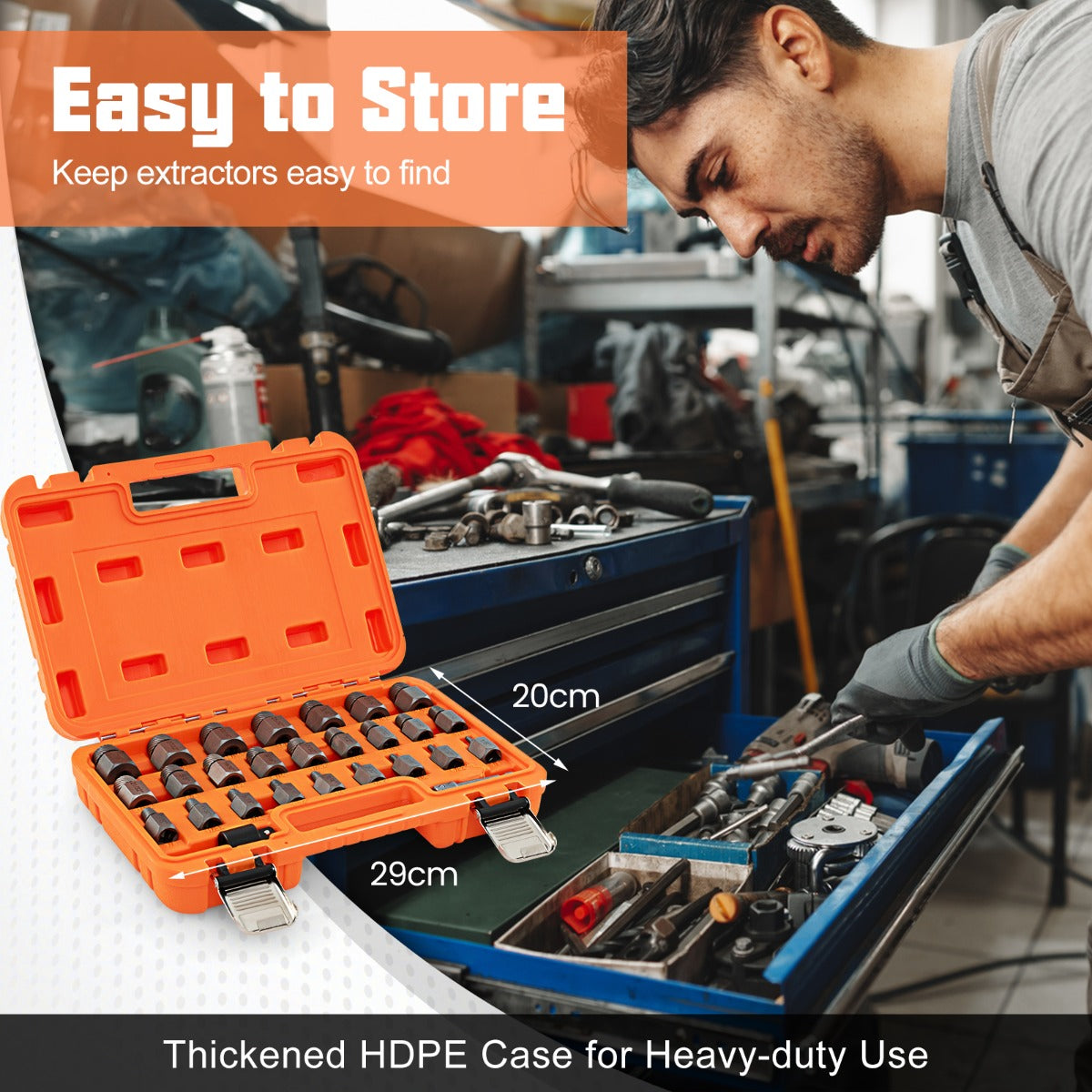 Brede toepassing voor het verwijderen van gebroken, verroeste of beschadigde bouten en schroeven De 27-delige schroevenverwijderaarset is geschikt voor een breed scala aan gebroken schroeven en bouten Gemaakt van hoogwaardig Cr-Mo-staal met verhoogde sterkte en hardheid Warmtebehandeld oppervlak voor roestbestendigheid Extractor met dubbele kop en 3/8" vierkante aandrijving voor compatibiliteit Kan direct met een ratelsleutel worden gebruikt zonder dat er een verbindingsbus nodig is