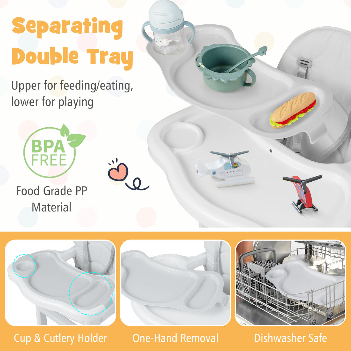 - Handig: Dubbel dienblad met 2 lagen voor eten en spelen, makkelijk te verplaatsen met universele wielen