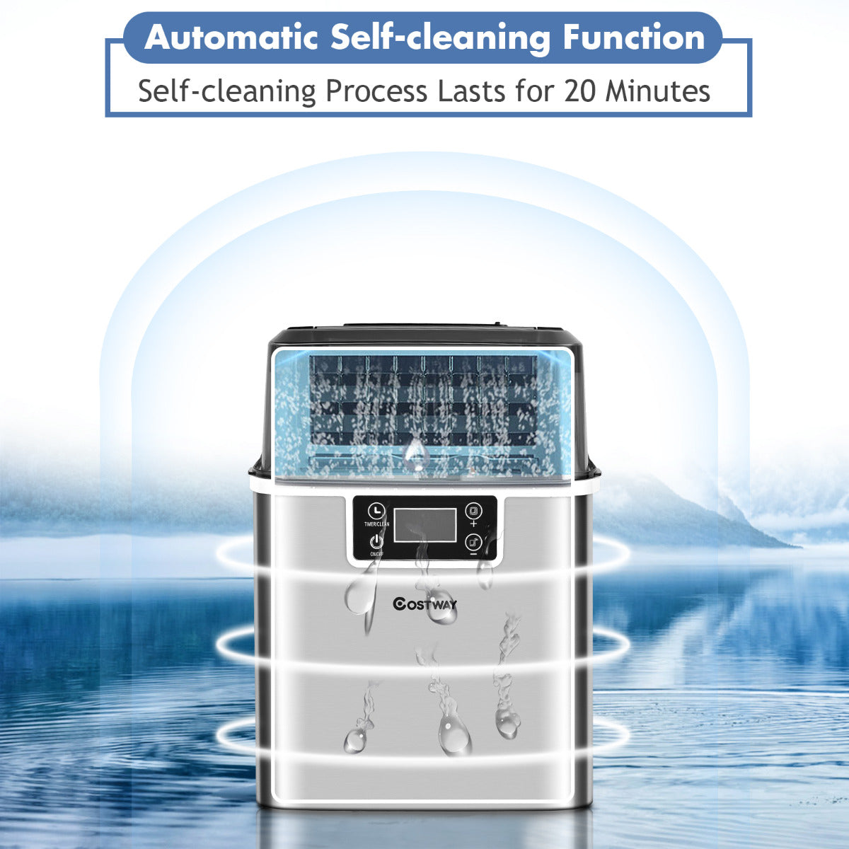 Verfris je zomer met de LIVSK aanrecht ijsmachine! Deze handige machine heeft een speciale zitting waarop je een fles van maximaal 5 L water kunt plaatsen (fles niet inbegrepen), zodat je constant water kunt toevoegen aan de 3,2 L watertank. Je kunt ook direct water toevoegen via de watertoevoer opening. Met een nikkel-messing compressor produceert deze ijsmaker zuiver en zeer stevig vierkant ijs, 24 stuks per cyclus en maximaal 18 kg per dag. Pas de dikte van de ijsblokjes aan door de condensatietijd te regelen. De ijsmachine beschikt over een handige zelfreinigende functie voor eenvoudig dagelijks onderhoud. Het LCD-bedieningspaneel is makkelijk te gebruiken en heeft indicatoren voor watertekort en ijsvol, voor veilig gebruik.