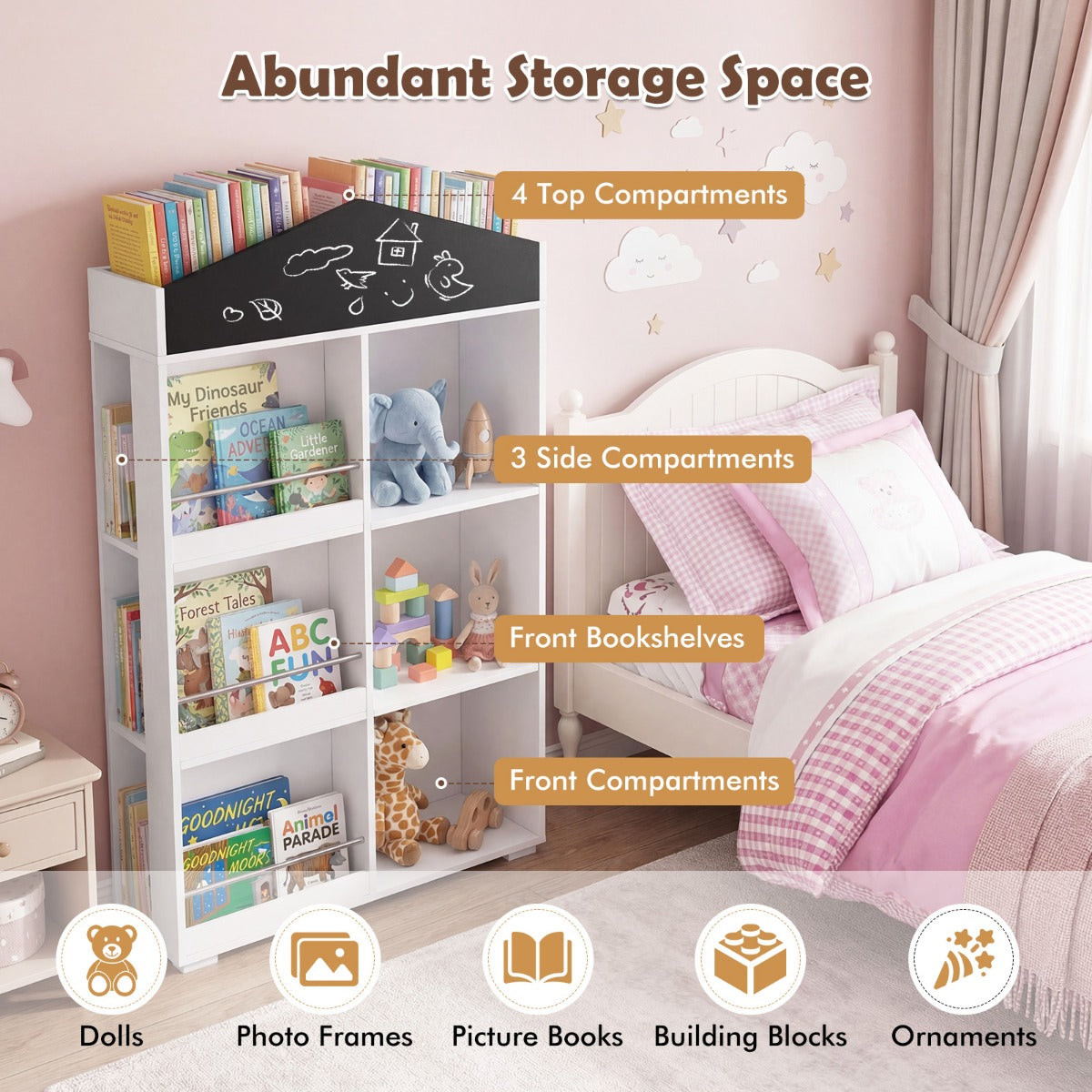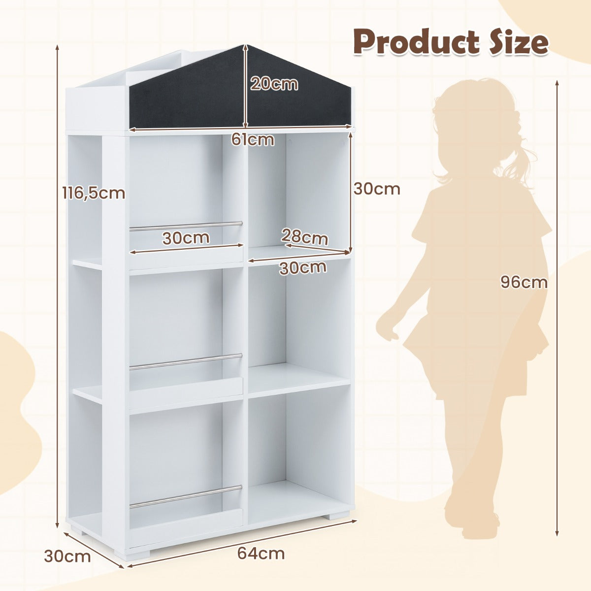 - Optimale opbergruimte: Deze boekenkast in de vorm van een huisje zorgt voor een overzichtelijke indeling met ruimte voor prentenboeken, poppen, bouwblokken en souvenirs.