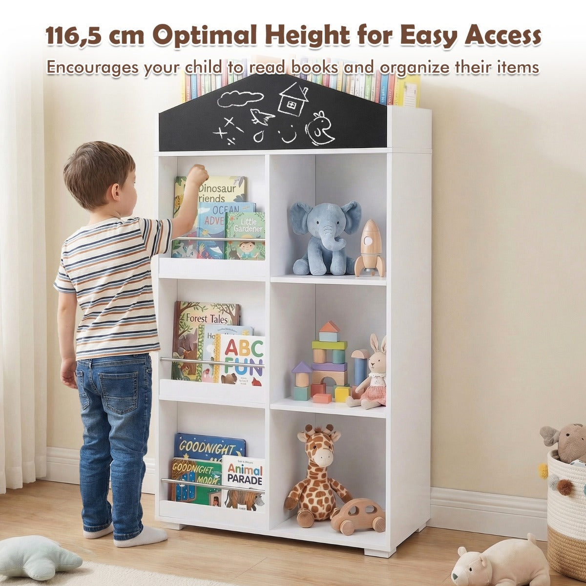 - Toegankelijkheid voor kinderen: Met een hoogte van 116,5 cm zijn boeken en speelgoed altijd binnen handbereik.