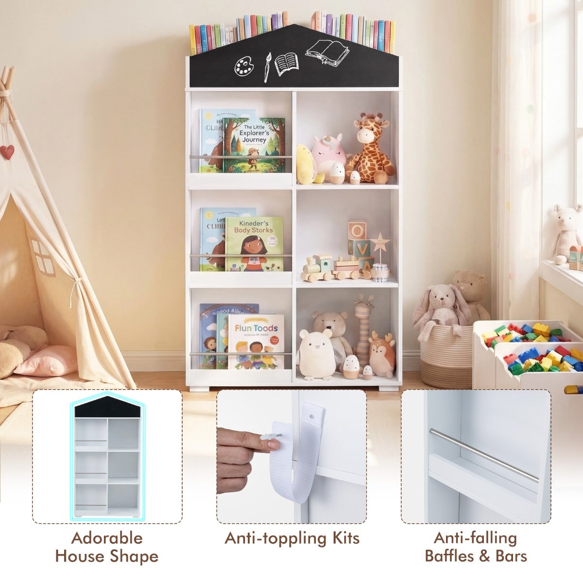 Maak de kinderkamer een opgeruimde en speelse ruimte met de LIVSK boekenkast in de vorm van een huisje! Deze unieke boekenkast biedt met zijn 3 planken aan de voorkant, 3 vakken aan de voorkant, 3 vakken aan de zijkant en 4 vakken bovenin een overzichtelijke opbergruimte voor prentenboeken, poppen, blokken en souvenirs. Het ingebouwde krijtbord nodigt kinderen uit om te schrijven en tekenen, wat hun verbeelding en creativiteit stimuleert. Dankzij de hoogte van ongeveer 116,5 cm en het open ontwerp kunnen kinderen zelfstandig spullen uitkiezen en opbergen. Veiligheidsvoorzieningen zoals valbeveiliging, metalen stangen, afgeronde hoeken en een glad oppervlak zorgen voor extra veiligheid. Inclusief verbrede voet en anti-kantelkit voor meer stabiliteit.
