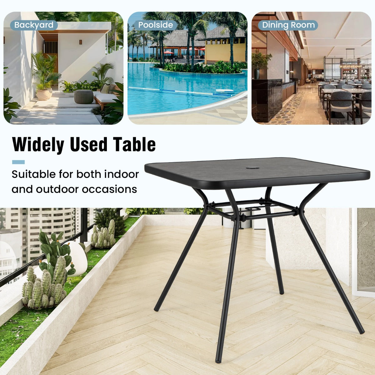 De LIVSK buitentafel is ideaal voor gezellig samenzijn in de tuin. Met afmetingen van 80 x 80 x 72,5 cm biedt deze tafel plaats aan maximaal 4 personen voor drankjes, snacks of andere benodigdheden. Het SPC-tafelblad is slijtvast, krasbestendig en waterbestendig, waardoor het er altijd als nieuw uitziet, zelfs bij intensief gebruik. Het stevige metalen frame zorgt voor een uitstekend draagvermogen en stabiliteit, terwijl de verstelbare poten ervoor zorgen dat de tafel op elk oppervlak in balans blijft. Of het nu binnen of buiten is, deze tuintafel past perfect bij elke gelegenheid.