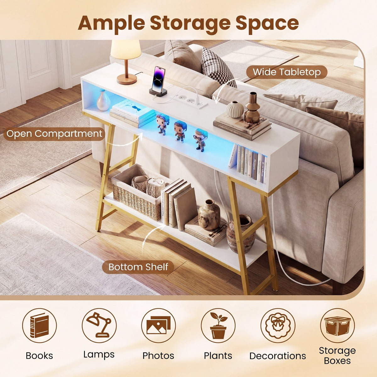 Geef je woonkamer een upgrade met de LIVSK consoletafel! Deze stijlvolle tafel is voorzien van geïntegreerde ledverlichting die een subtiele sfeer creëert, waardoor je ruimte echt opvalt. Met een handig ingebouwd oplaadstation en een kabelgat blijft alles georganiseerd en uit het zicht, perfect voor het opladen van je apparaten. De 3-traps haltafel biedt voldoende ruimte om decoratieve voorwerpen te presenteren en belangrijke spullen op te bergen. Het stevige metalen frame garandeert duurzaamheid en stabiliteit, terwijl de verstelbare voetkussentjes zorgen voor een perfecte plaatsing. Voor extra veiligheid zijn er kantelbeveiligingssets die de tafel stevig aan de muur bevestigen.