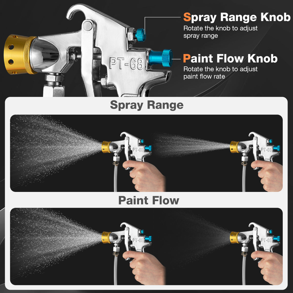 - Volledig aanpasbaar: 3 instelknoppen voor sproeibereik, kleurstroom en luchthoeveelheid