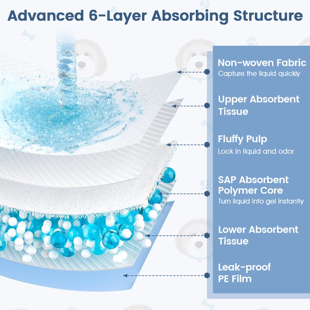 Met de LIVSK honden- en puppy-urinepads geef je jouw huisdier het ultieme comfort bij de opvoeding en verzorging. Deze pads zijn ideaal voor honden, katten, konijnen en zelfs eenden, en zijn een onmisbaar onderdeel in elk huisdierhuishouden. Dankzij het robuuste 6-laags ontwerp met pluizige cellulose en een geavanceerde SAP-absorptiekern worden vloeistoffen snel omgezet in gel, wat lekkages en nare geurtjes effectief voorkomt. Zo blijft de omgeving van je huisdier schoon en droog, en worden je vloeren en meubels beschermd.