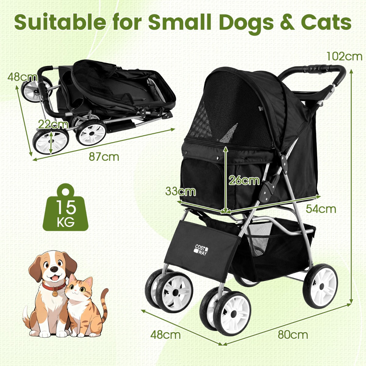 Maak het vervoeren van je huisdieren gemakkelijker met de LIVSK huisdierenwagen. Gemaakt van stevig Oxford-materiaal dat water-, kras- en bijtbestendig is, biedt deze wagen veilige en comfortabele ritten voor huisdieren tot 15 kg. De panoramische gaasramen en de verstelbare kap zorgen voor voldoende frisse lucht en zonlicht, terwijl de handige ritssluitingen aan de voor- en achterkant instappen kinderspel maken. Dankzij de soepel draaiende voorwielen met vergrendeling en de achterwielen met een voetrem is de wagen stabiel en makkelijk te manoeuvreren op verschillende terreinen. Met het slimme vouwsysteem kan je de lichte hondenwagen in enkele seconden ruimtebesparend opvouwen, ideaal voor onderweg!