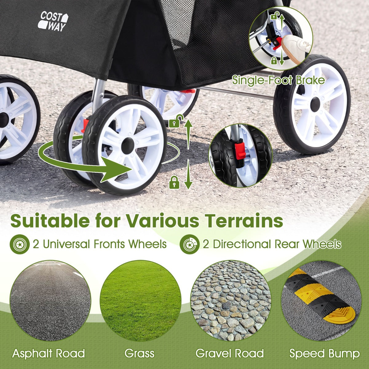 - Soepele mobiliteit: Voorzien van 2 draaibare voorwielen met vergrendeling en 2 bestuurbare achterwielen voor een comfortabele rit