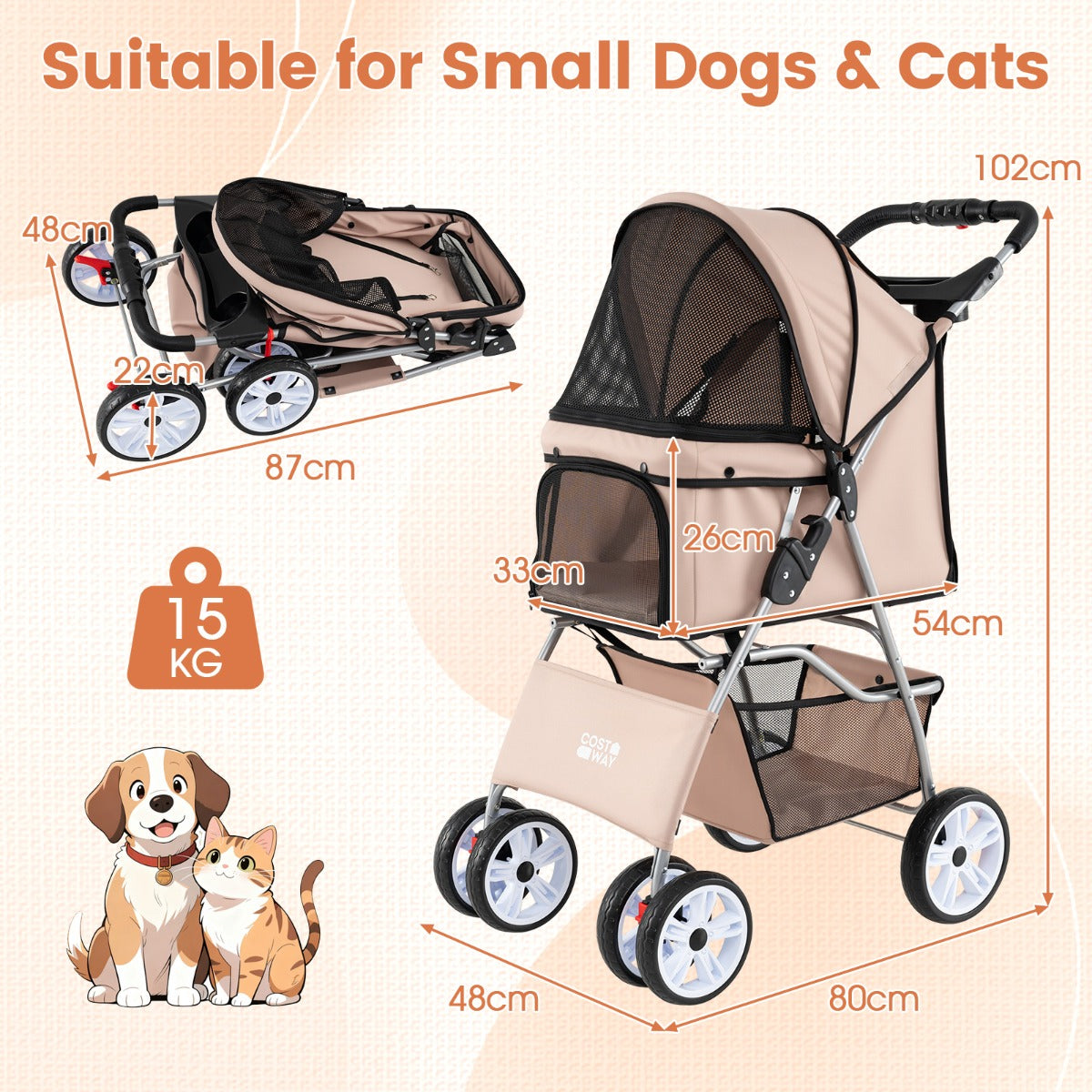Maak wandelingen met je huisdier nog aangenamer met de LIVSK huisdierenwagen. Deze praktische wagen is vervaardigd uit stevig Oxford-materiaal en is water-, kras- en bijtbestendig, waardoor je huisdieren tot 15 kg veilig kunt vervoeren. De panoramische gaasramen en de verstelbare kap zorgen voor frisse lucht en zonlicht tijdens elke rit. Dankzij de ritssluitingen aan de voor- en achterkant kunnen je huisdieren eenvoudig instappen. De soepel draaiende voorwielen met vergrendeling en de achterwielen met een voetrem bieden stabiliteit en wendbaarheid op diverse terreinen. Met het slimme vouwsysteem is deze lichte hondenwagen in een handomdraai op te vouwen, ideaal voor onderweg.