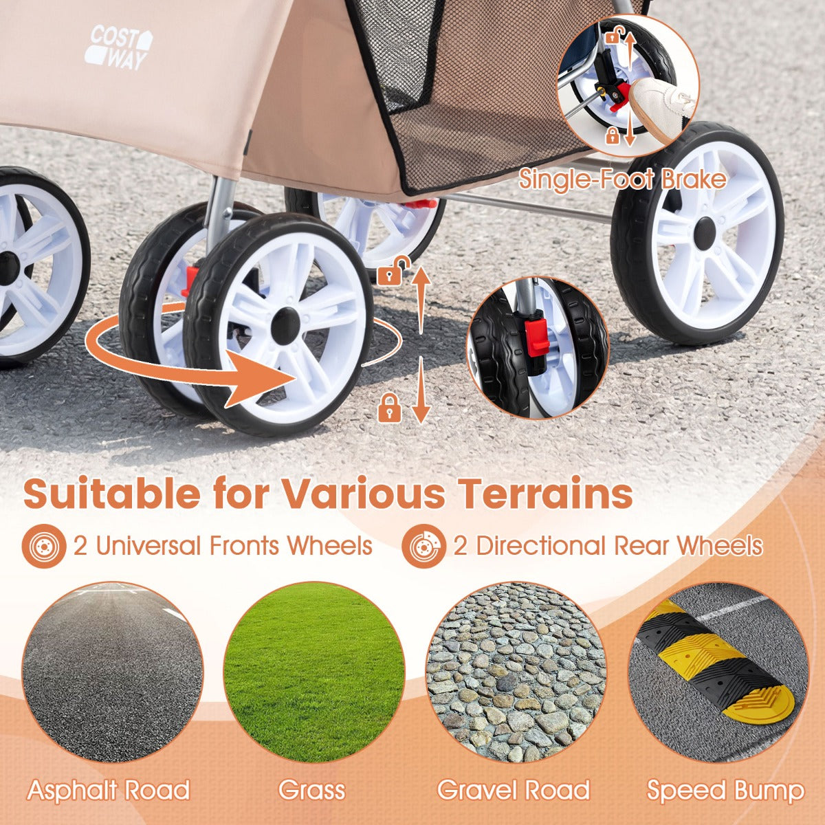 - Soepele mobiliteit: Voorzien van 2 draaibare voorwielen met vergrendeling en 2 bestuurbare achterwielen voor een veilige en comfortabele rit