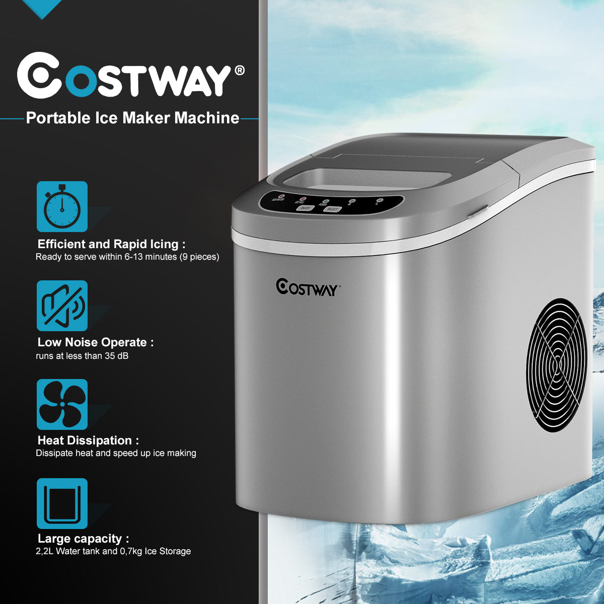 - Efficiëntie en stilte: 9 ijsblokjes in 6-13 minuten, tot 12 kg per dag, minder dan 35dB geluidsniveau