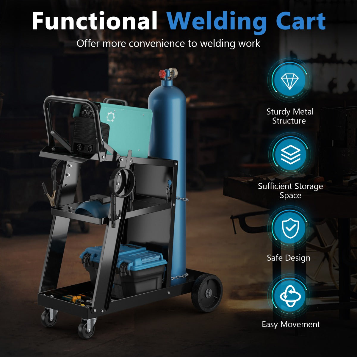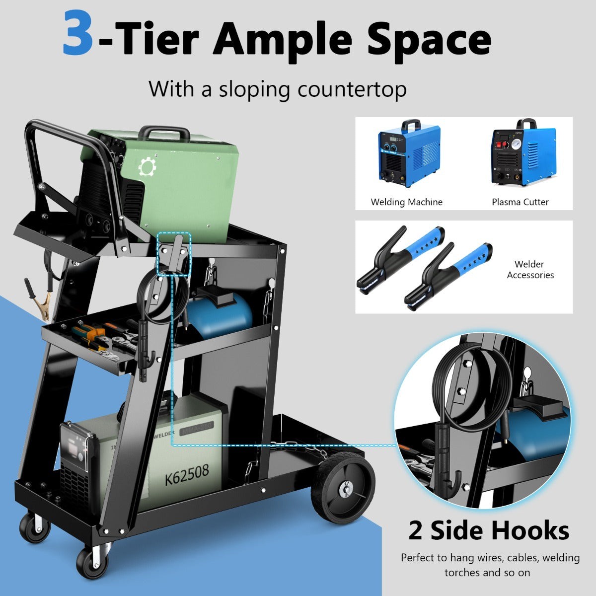 - Georganiseerde opbergruimte: drie niveaus om lasaccessoires overzichtelijk op te bergen, inclusief zijhaken voor extra ophangmogelijkheden
