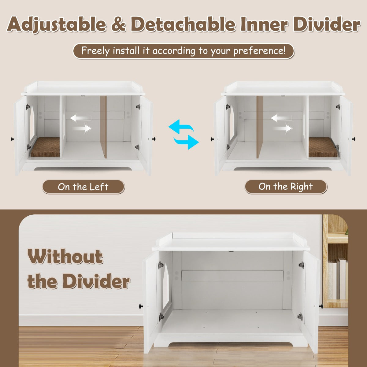 - Veelzijdig gebruik: kan dienen als kattenhuis, bijzettafel en opbergkast