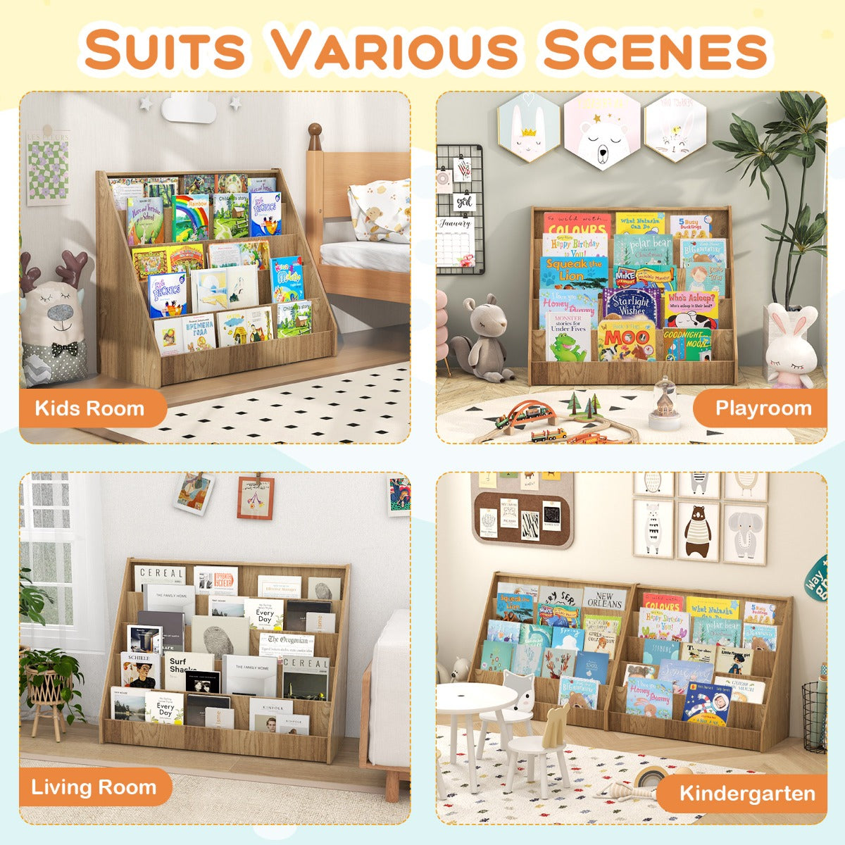 De LIVSK kinderboekenkast is het perfecte meubelstuk om een gezellige leeshoek te creëren voor je kinderen. Met 5 diepe en lange planken biedt deze boekenkast voldoende ruimte voor grote boeken zoals prentenboeken, stripboeken en meer. Het kindvriendelijke ontwerp met een hoogte van 76 cm maakt het gemakkelijk toegankelijk voor peuters, terwijl de frontdisplay kinderen aanmoedigt om zelf hun leesmateriaal te kiezen.