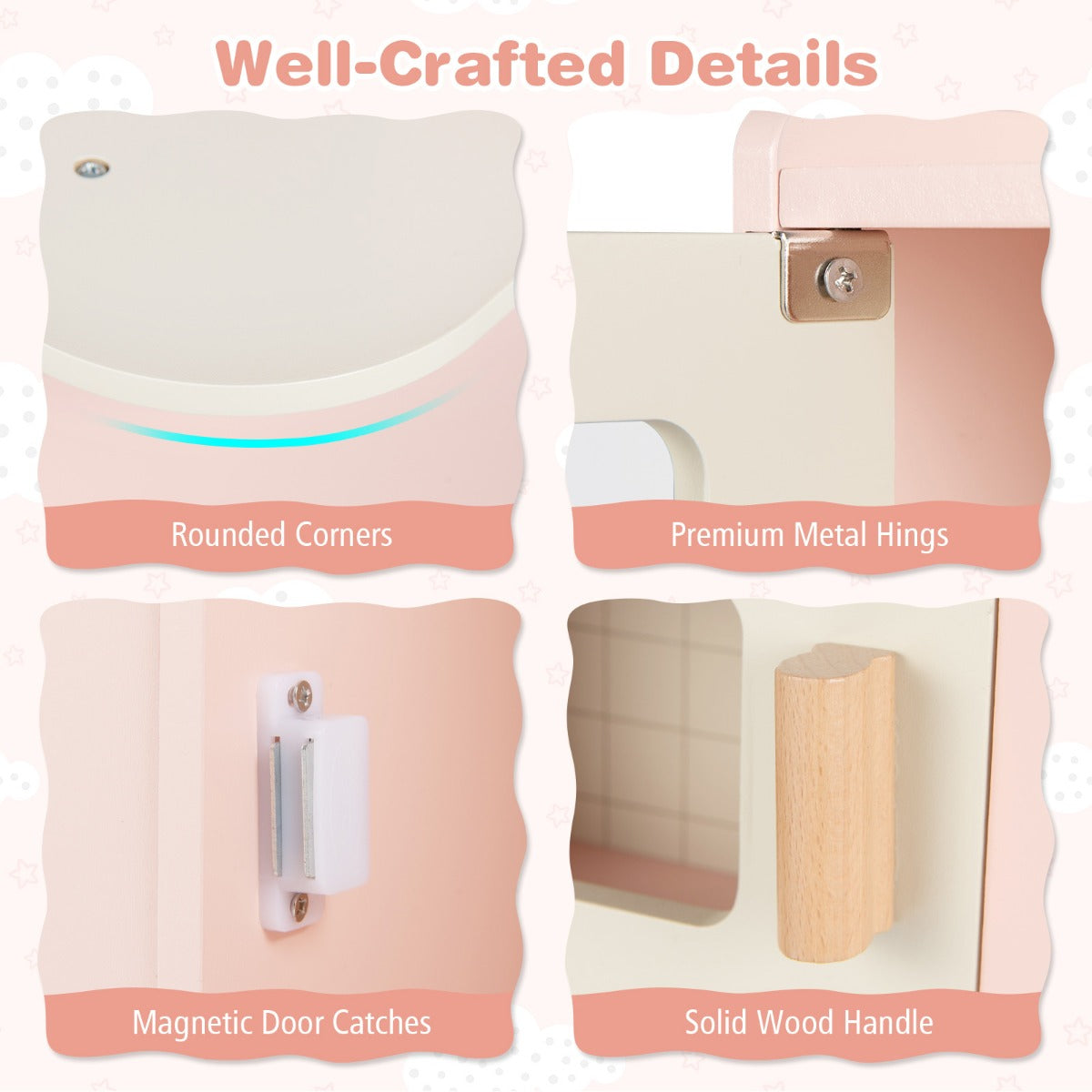 - Praktische opbergruimte: Met een kruidenrek, werkblad, opbergkast en haken leren kinderen op een speelse manier de waarde van netheid en organisatie kennen.