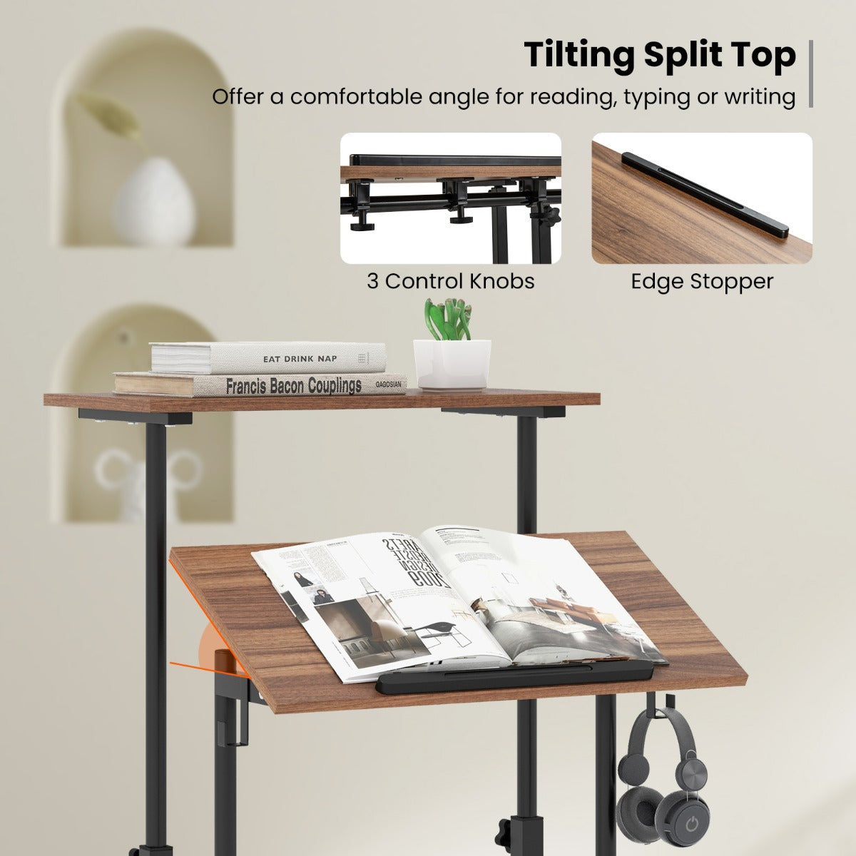 Wil je je werkplek flexibeler maken? Kies dan voor het LIVSK mobiele sta-bureau. Met verstelbare hoogte en kantelbare tafelbladen schakel je gemakkelijk tussen zitten en staan, perfect voor een actieve werkhouding. Dankzij de soepel rollende wielen verplaats je de tafel moeiteloos naar elke ruimte in huis. En voor een vaste opstelling vergrendel je eenvoudig de wielen. Het compacte en stevige ontwerp zorgt voor een opgeruimde werkplek met behoud van stabiliteit en functionaliteit. Maak je werkdag efficiënter en comfortabeler met dit multifunctionele sta-bureau!