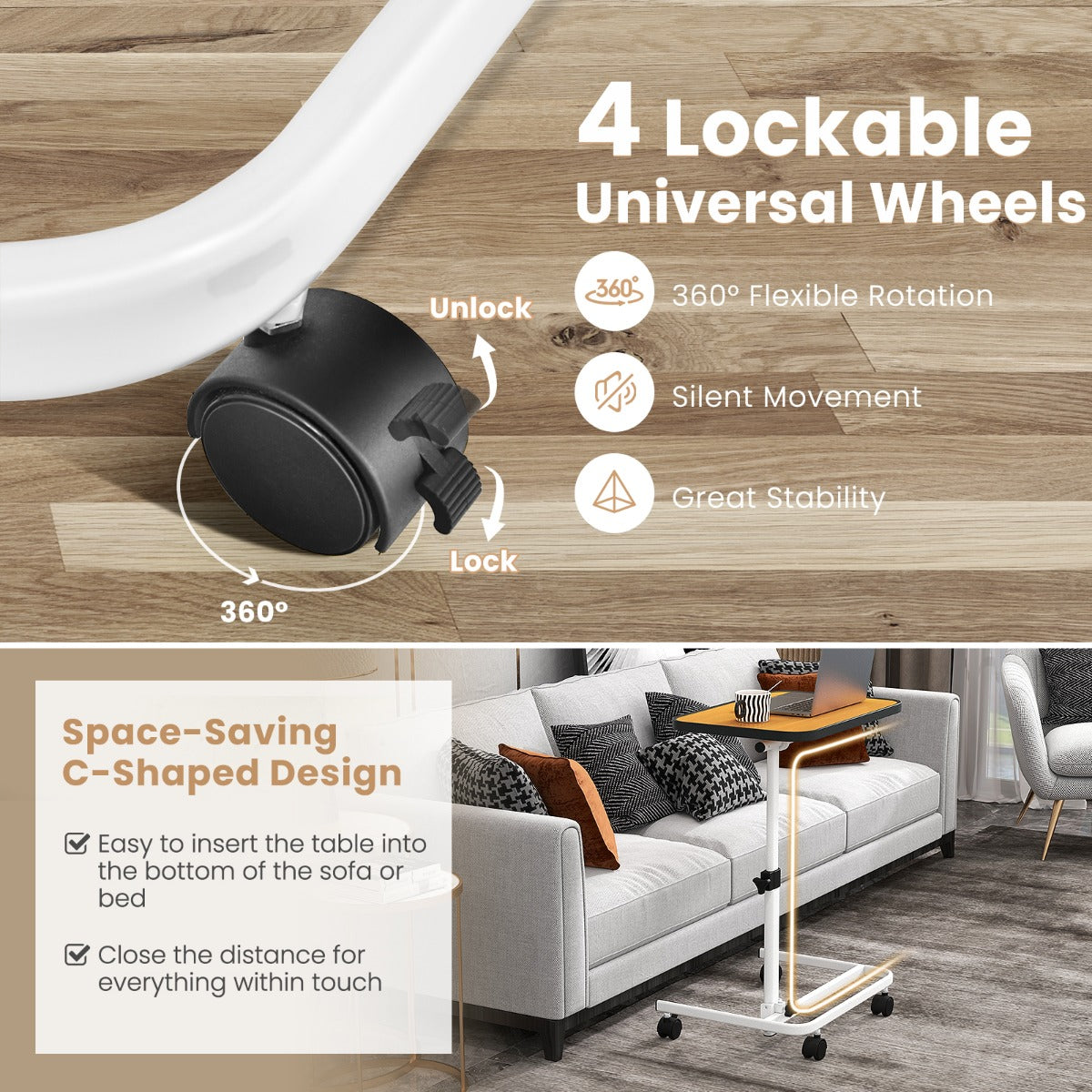 LIVSK Multifunctionele Laptoptafel - Verstelbare Hoogte 73-93 cm - Draaibaar Blad - C-vormig - Ruimtebesparend - Wit + Natuur