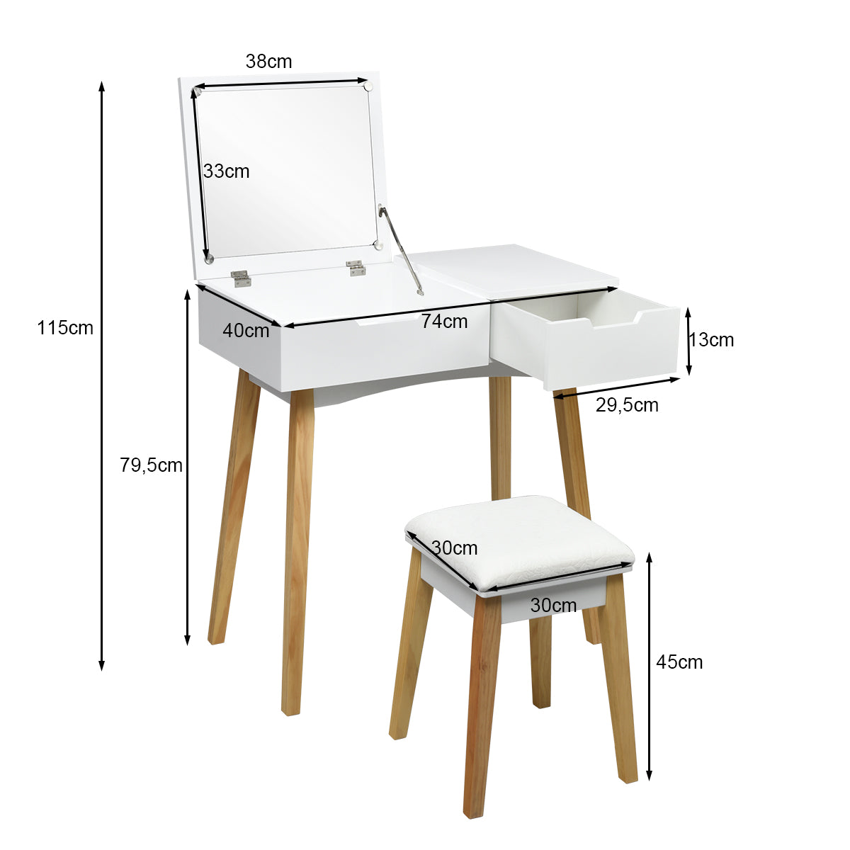 - Afmeting tafel: 74 x 40 x 115 cm (LxBxH)
