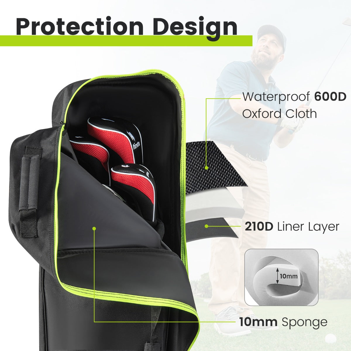 Gevoerd met zachte spons om je golfclubs te beschermen Gemaakt van slijtvaste, waterdichte Oxford stof Voorzien van kaarthouder en opbergvak Gemakkelijk te verplaatsen en vervoeren dankzij wielen en 3 handgrepen Voorzien van een soepele tweewegrits met sleutelgat en slot Gemaakt met een slijtvaste en stevige basis Past op de meeste golftassen met een universeel ontwerp